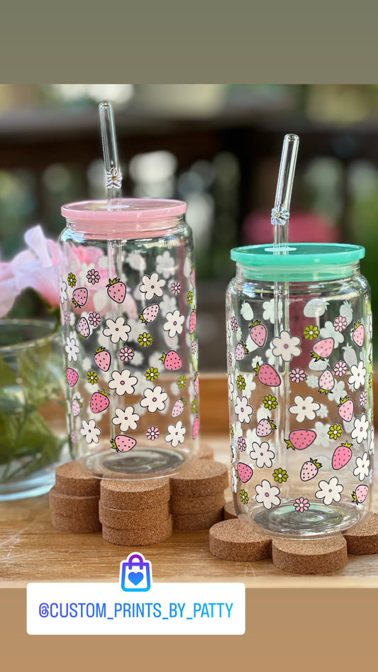 Beer can glass with lid, Strawberries and Daisies glass cup, strawberries Daisy cup, Strawberry glass cup, Iced Coffee Glass cup, Iced coffee tumblers, summer cups, bridesmaid gifts, gifts for her