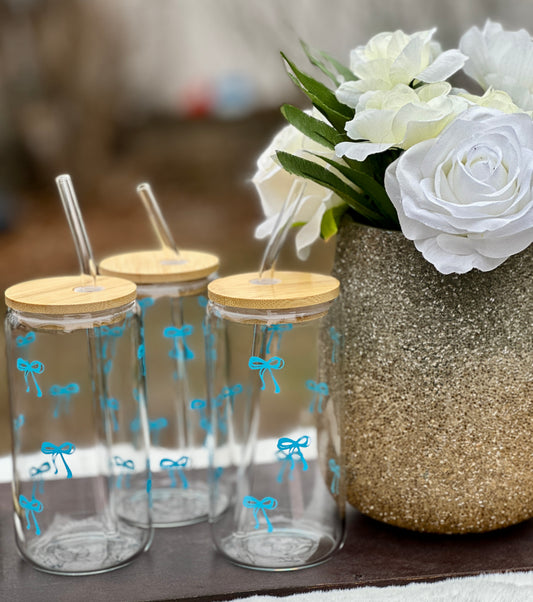 Cute bow iced coffee cup, blue bow drinking cup,Iced coffee cup, Dishwasher safe cups, can glass shape coffee cups , Birthday gifts.
