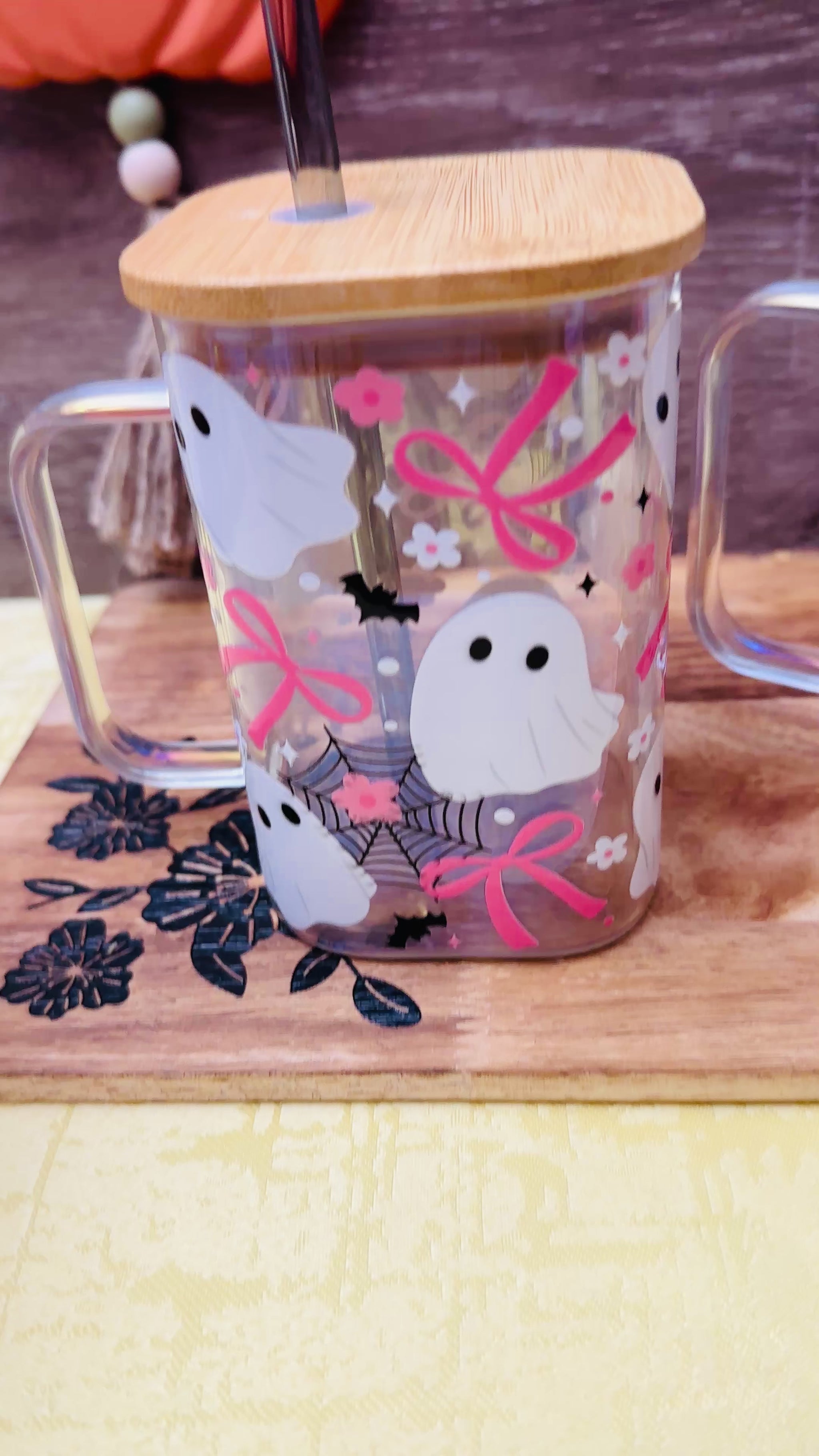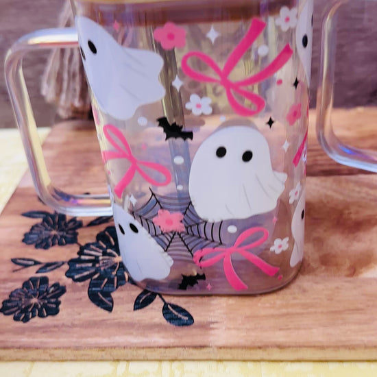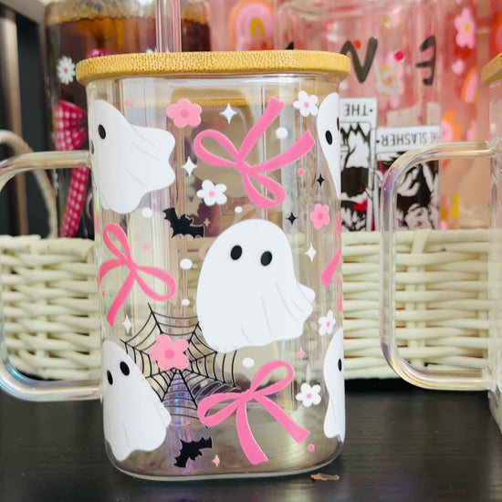 This 16oz acrylic mug is the perfect mix of fun and festive, decorated with playful white ghosts, pink bows, spiderwebs, bats, and flowers. Each cup comes with a reusable straw topped with a mini ghost charm for the ultimate Halloween vibe.
